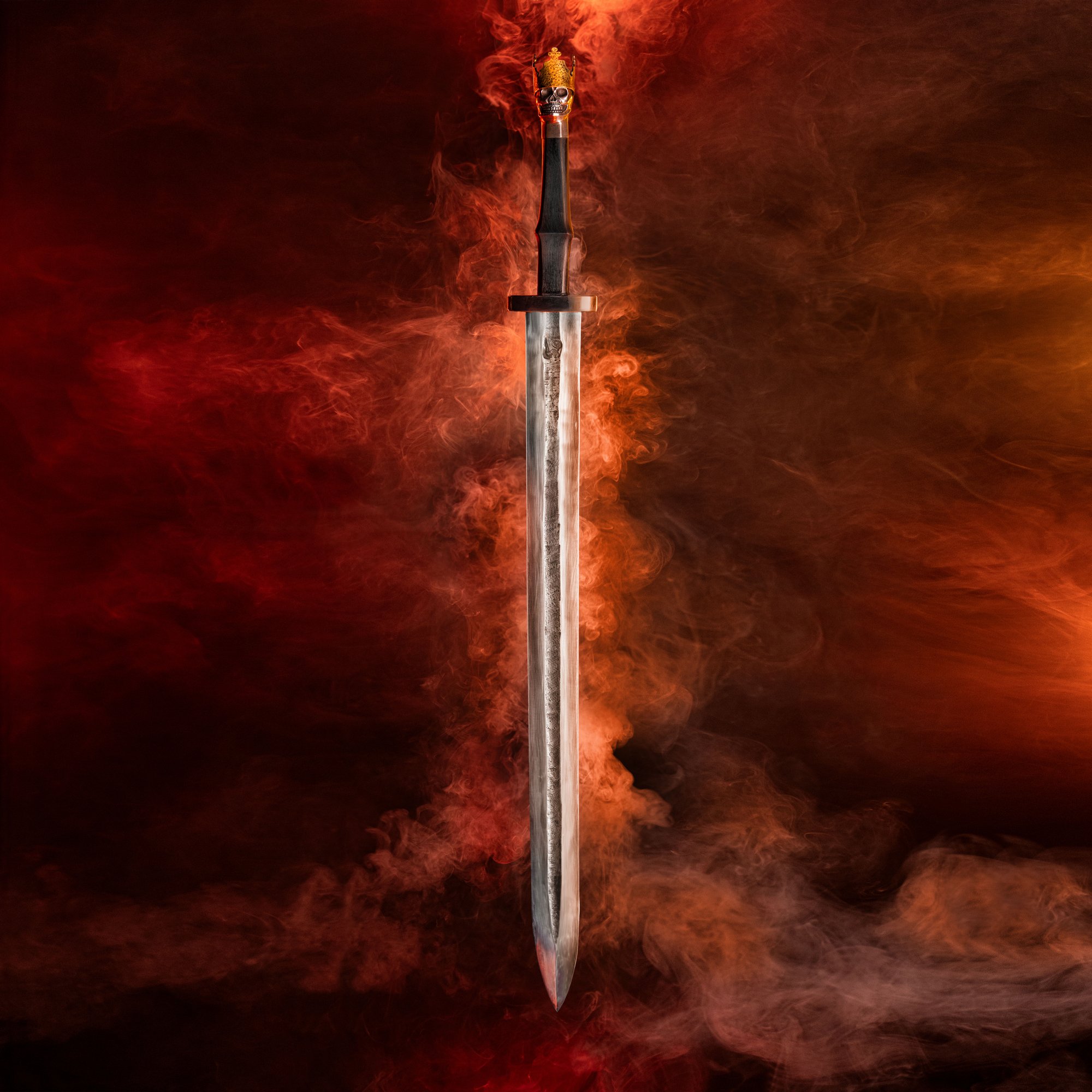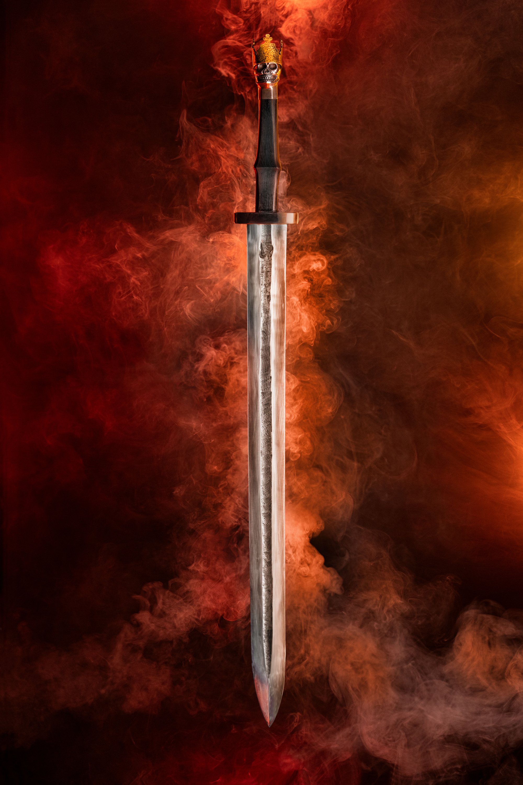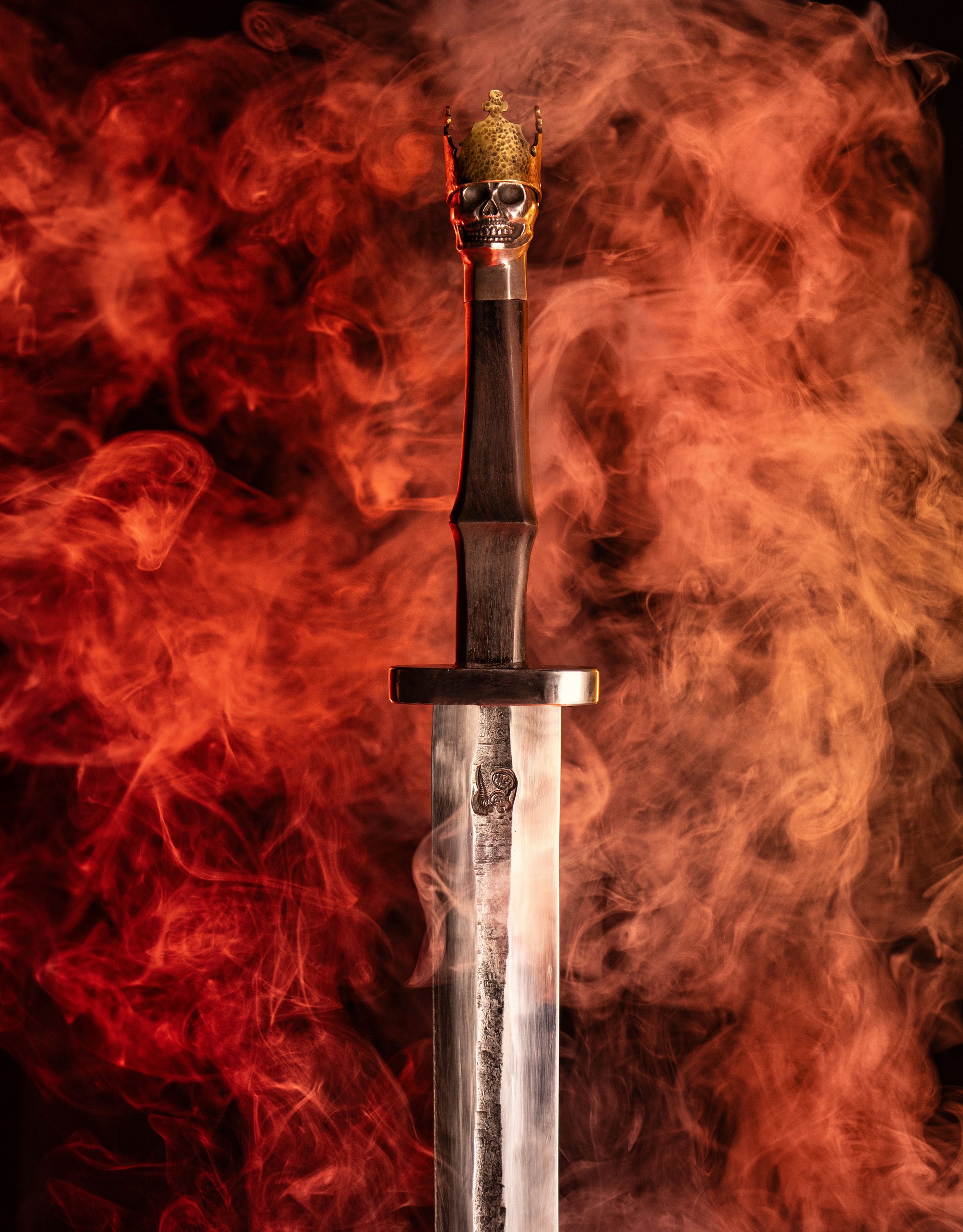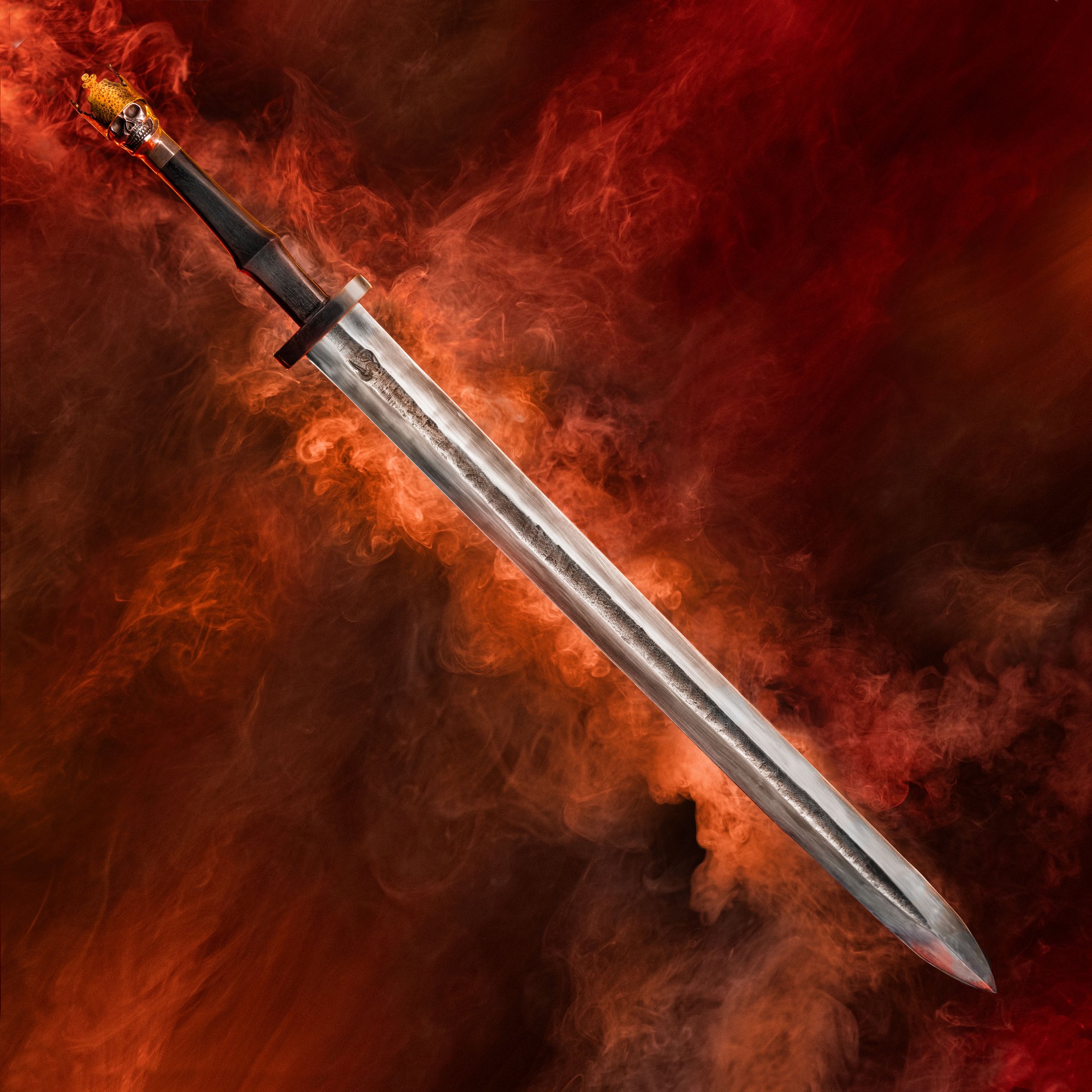 The swords feature a guard and pommel designed with a distinctive skull motif, intricately shaped from a century-old wrought iron anchor chain, adding a touch of historical reverence to their construction. The handle, made from African Blackwood, is crowned with brass, lending each sword a regal allure that is as elegant as it is deadly. This unique blend of craftsmanship and heritage ensures that each sword is not only a weapon of unmatched quality but also a work of art, embodying the spirit and resilience of the champions it honors.